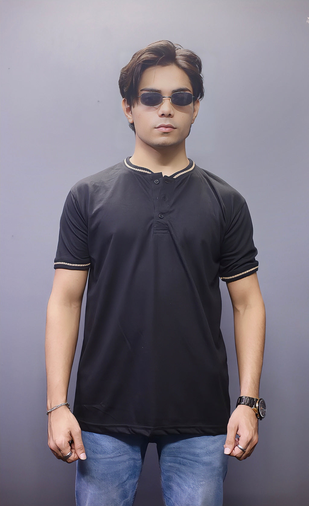 Don't Forget to grab our stylish Black Henley V neck style T shirts made with premium cotton jersey fabric with high quality stitching and rib in arms having small medium large x large sizes.