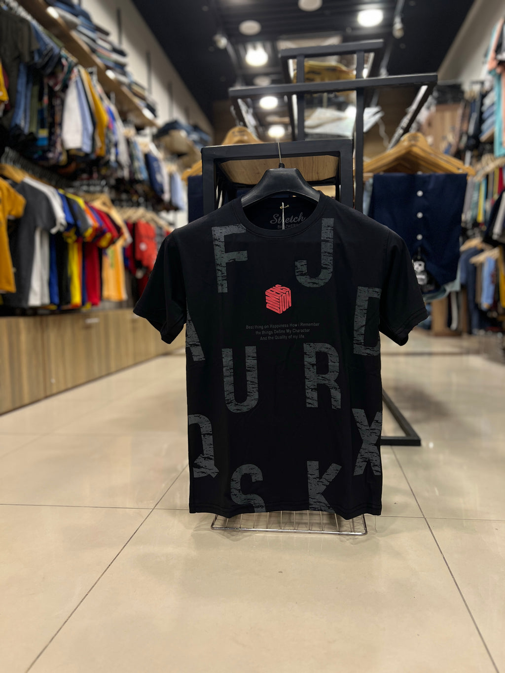 A classic crew neck and vibrant printed graphics characterize a comfortable and fashionable wardrobe staple: a round neck black printed T-shirt. Its loose fit and soft, breathable fabric make it ideal for layering or casual outings. A versatile base is provided by the black color, while personality and flair are added by the print. This T-shirt is a must-have for anyone wishing to effortlessly dress up their regular ensemble. It goes well with jeans, shorts, or under coats.